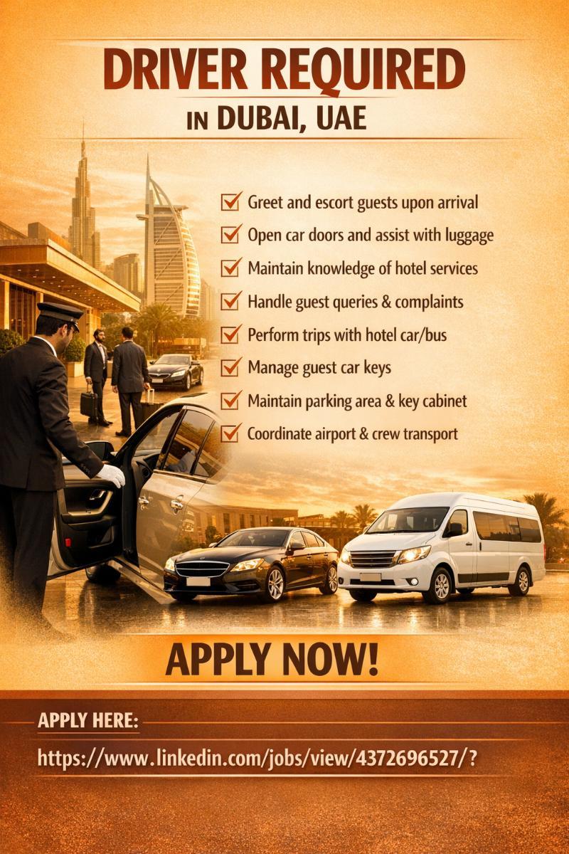 As a Driver you are responsible to meet and provide assistance to hotel guest upon arrival and departure, assist in any driving related duties and responsibilities whereby your role will include key responsibilities such as-