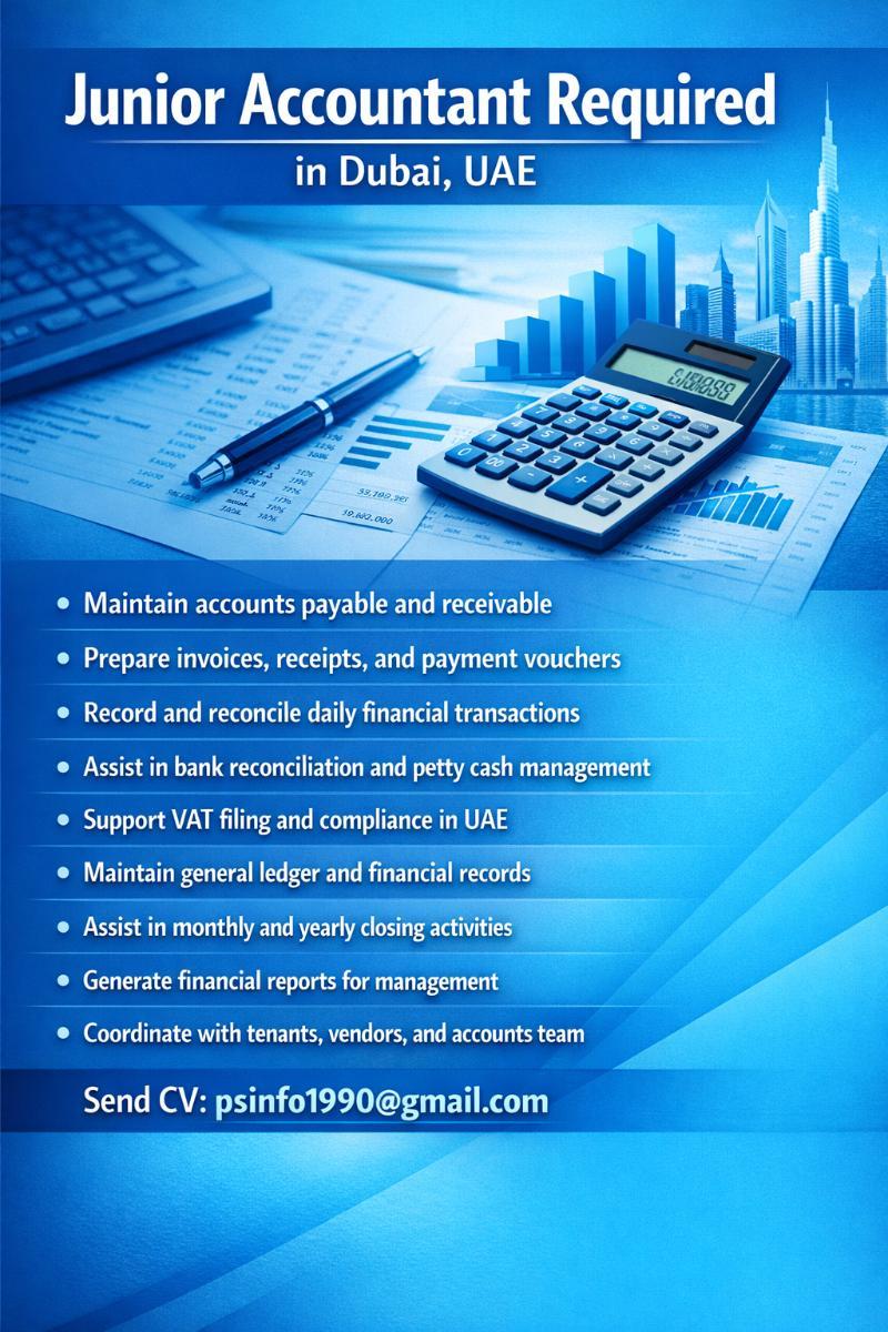 “We are hiring a Junior Accountant for Company – freshers and experienced candidates with knowledge of UAE VAT and accounting software are welcome to apply.”