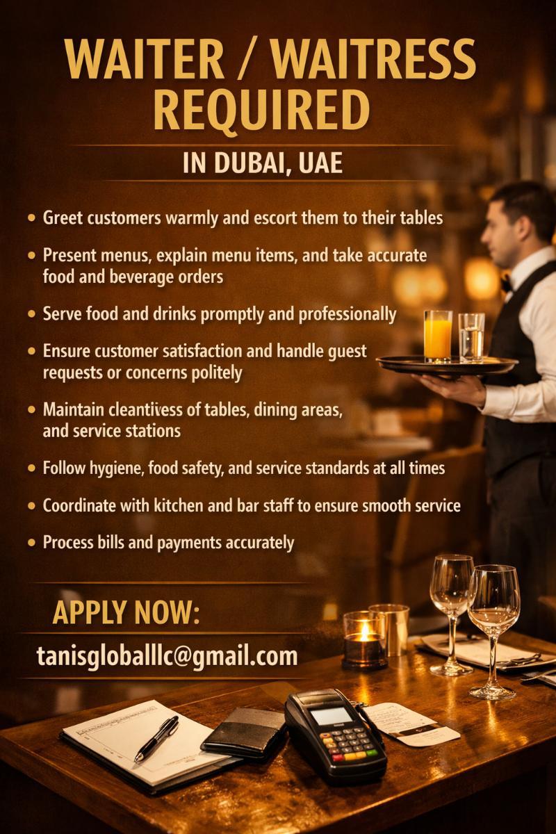 We are looking for a friendly, energetic, and customer-focused Waiter / Waitress to provide excellent food and beverage service to guests. The ideal candidate will ensure a pleasant dining experience by delivering high-quality service, maintaining cleanliness, and meeting customer needs efficiently.
